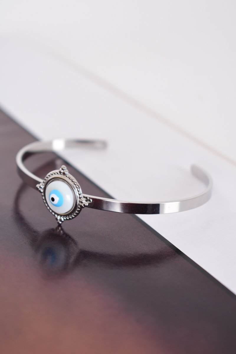 Γυναικείο βραχιόλι χειροπέδα με ματάκι, σε ασημί χρώμα κατασκευασμένο από ανοξείδωτο ατσάλι. Δεν μαυρίζει με το νερό.