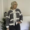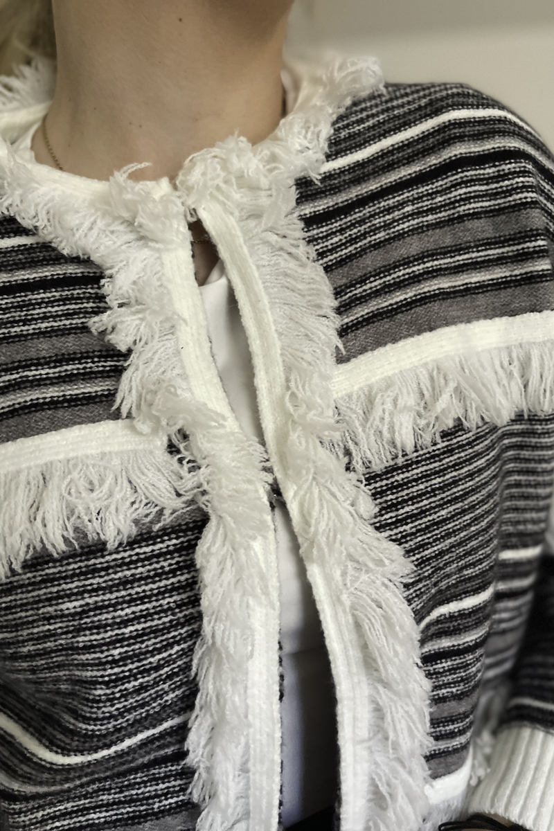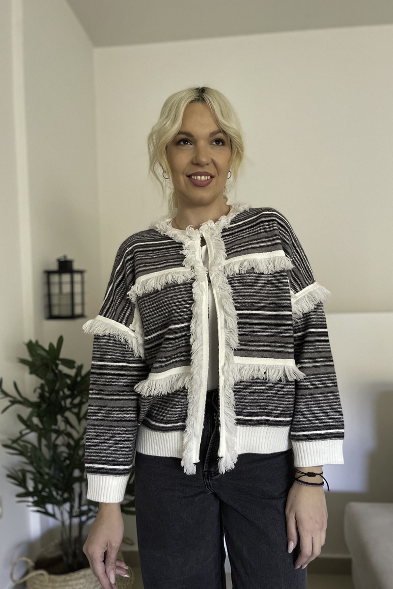 Ζακέτα με διχρωμία και κρόσσια, σε ασπρόμαυρους τόνους και υφή τύπου tweed. Διαθέτει στρογγυλή λαιμόκοψη και κλείνει στο μπροστινό μέρος με δύο μεταλλικές κόπιτσες, προσφέροντας κομψή και σταθερή εφαρμογή. Διαθέτει rib μανσέτες στα μανίκια και στο τελείωμα.
