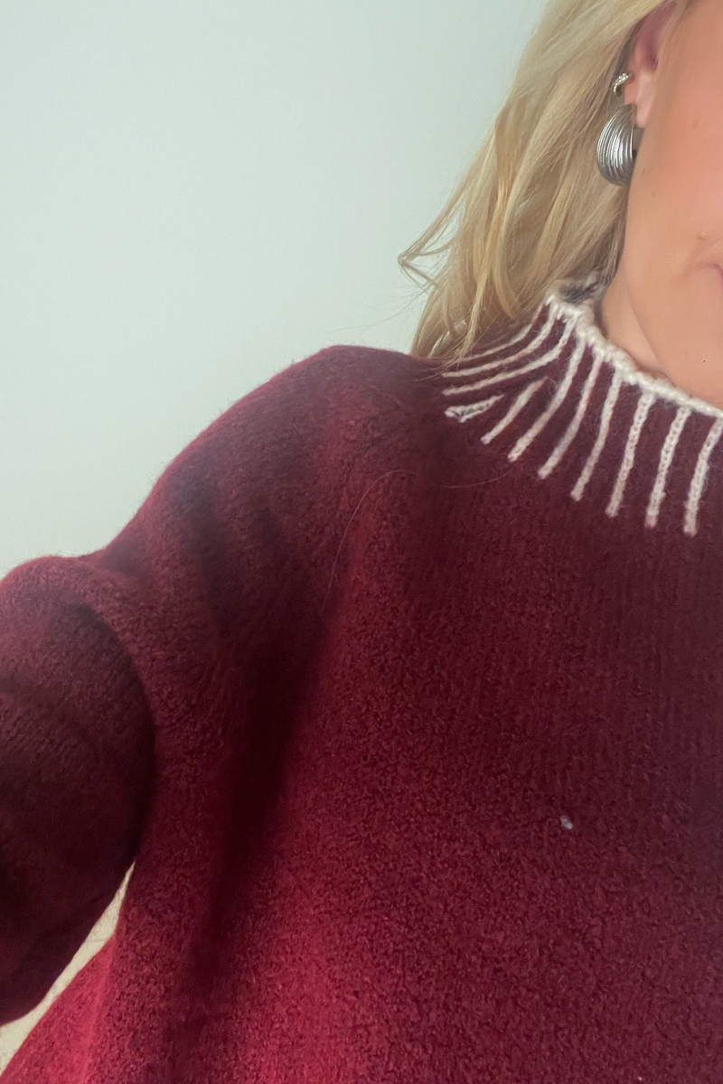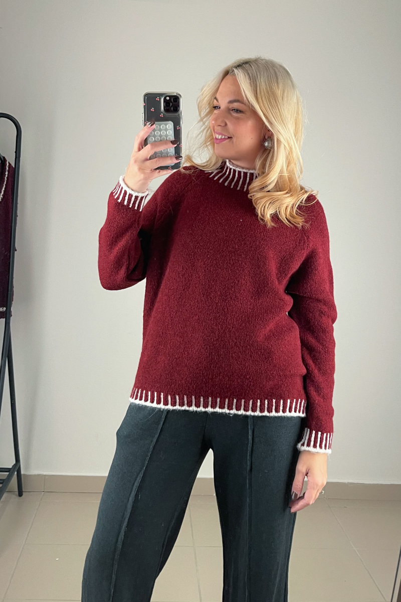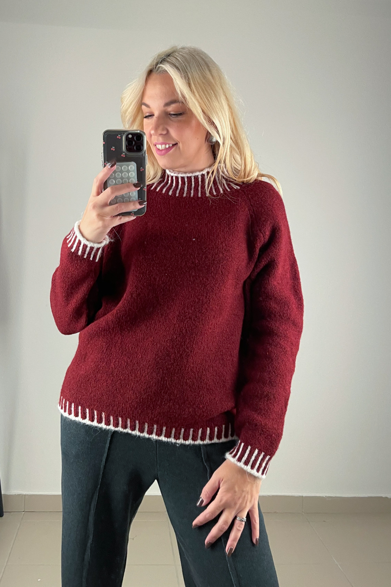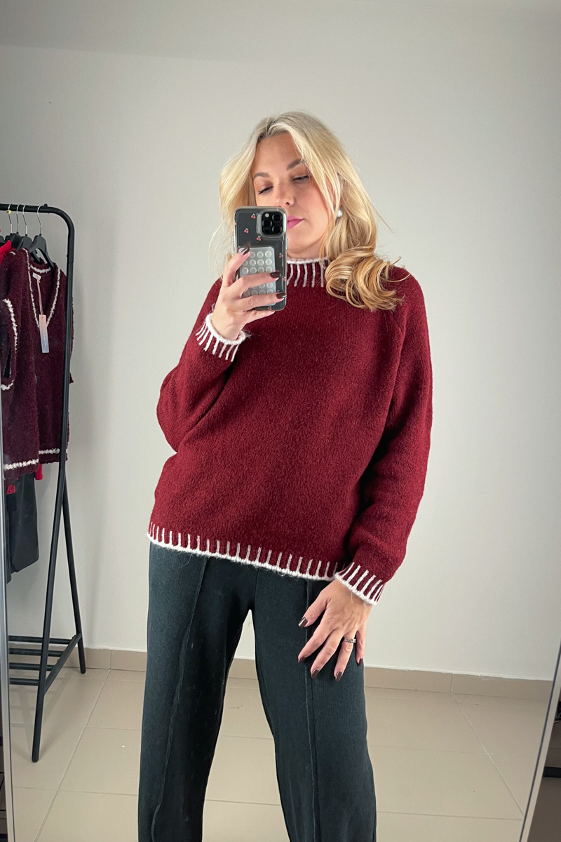 Πλεκτή μπλούζα σε μπορντό χρώμα με λευκές διακοσμητικές ραφές τύπου blanket στα τελειώματα. Διαθέτει μαλακή υφή και άνετη γραμμή.