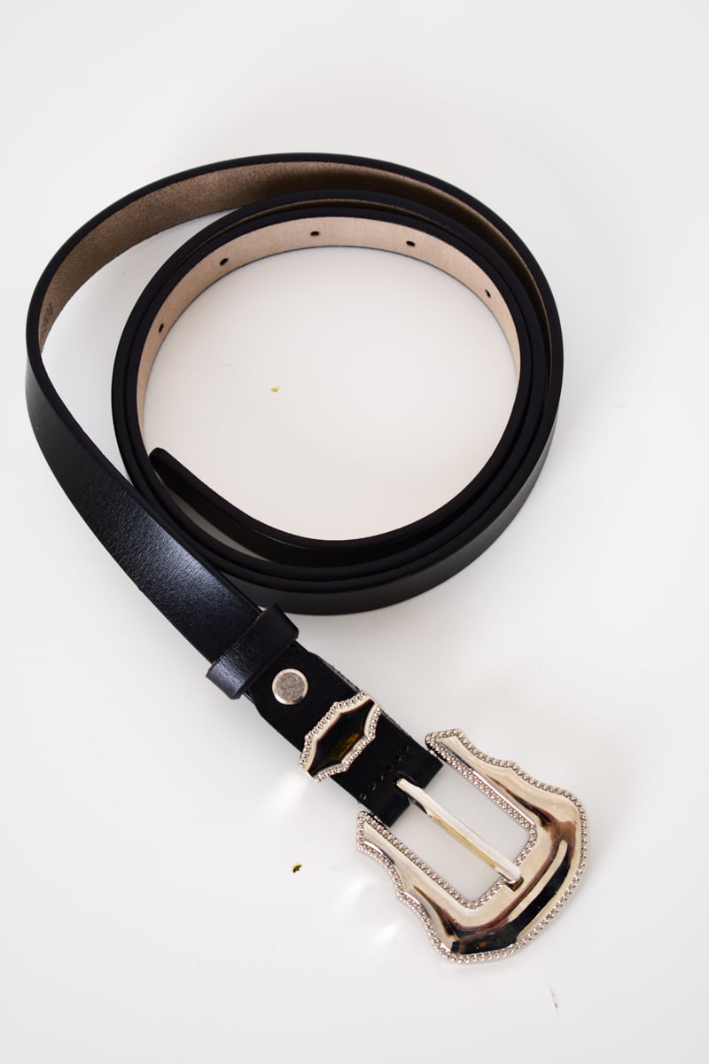 Γυναικεία ζώνη σε μαύρο χρώμα κατασκευασμένη από υψηλής ποιότητας γνήσιο δέρμα. Διαθέτει κομψή ασημί αγκράφα και μεταλλικές λεπτομέρειες.
